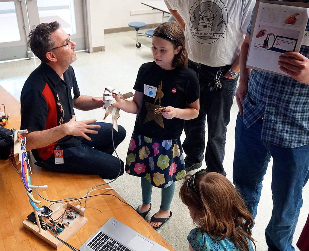 Heatherwood Elementary School student Sophia Tuft manipulates a “hand” as a Microsoft representative explains to her and parents how the technology works during a May 23 STEM Night event. (Contributed photo)