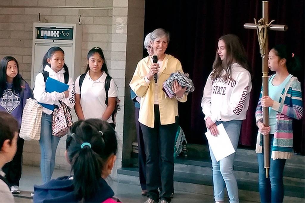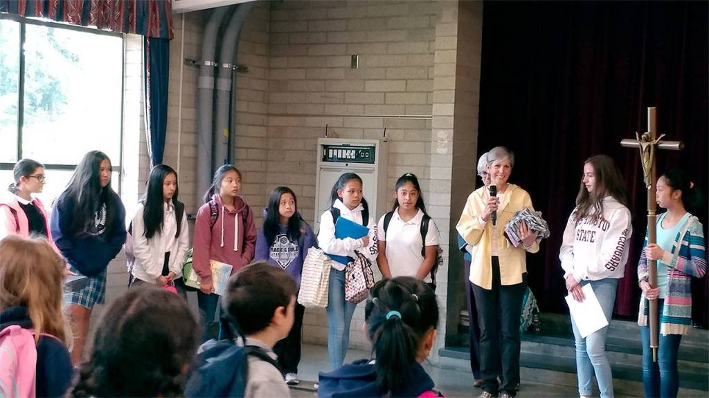 During the school year, teacher Patti Melton volunteers to lead a knitting group for families and students at St. Thomas More Parish School in Lynnwood. The knitting group recently presented scarves they made to the South Snohomish County Emergency Cold Weather Shelter.