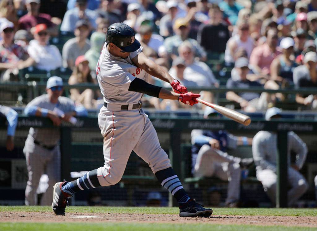 Seattle starting pitcher Mike Leake was tagged the five runs — all with two out — with three of them coming on a rocket of a home run from Rafael Devers off the windows of the Hit It Here Cafe well past the right-field wall.