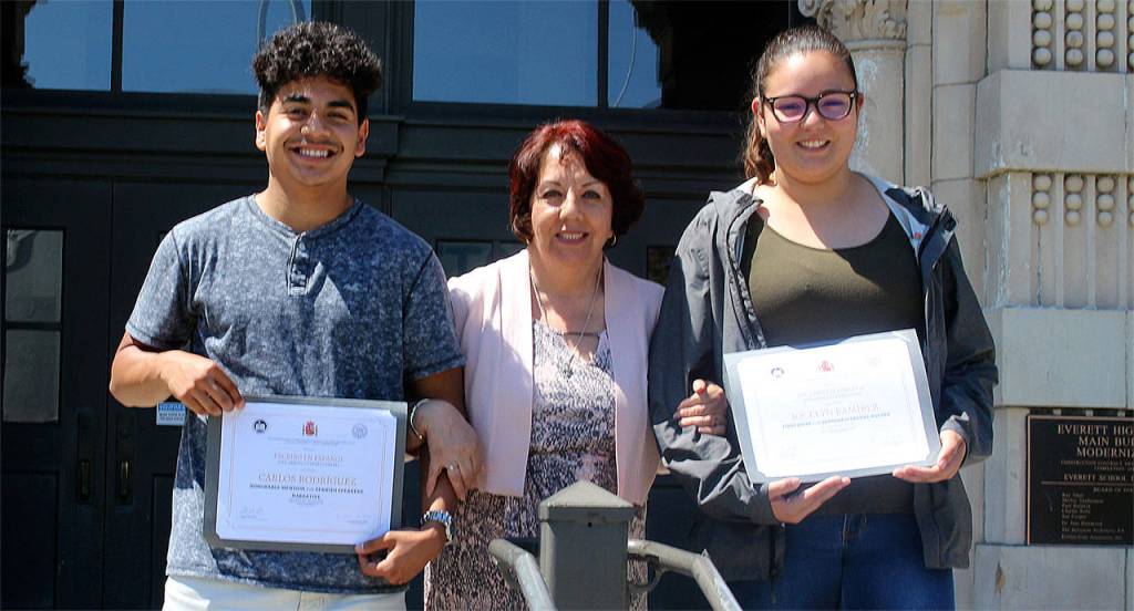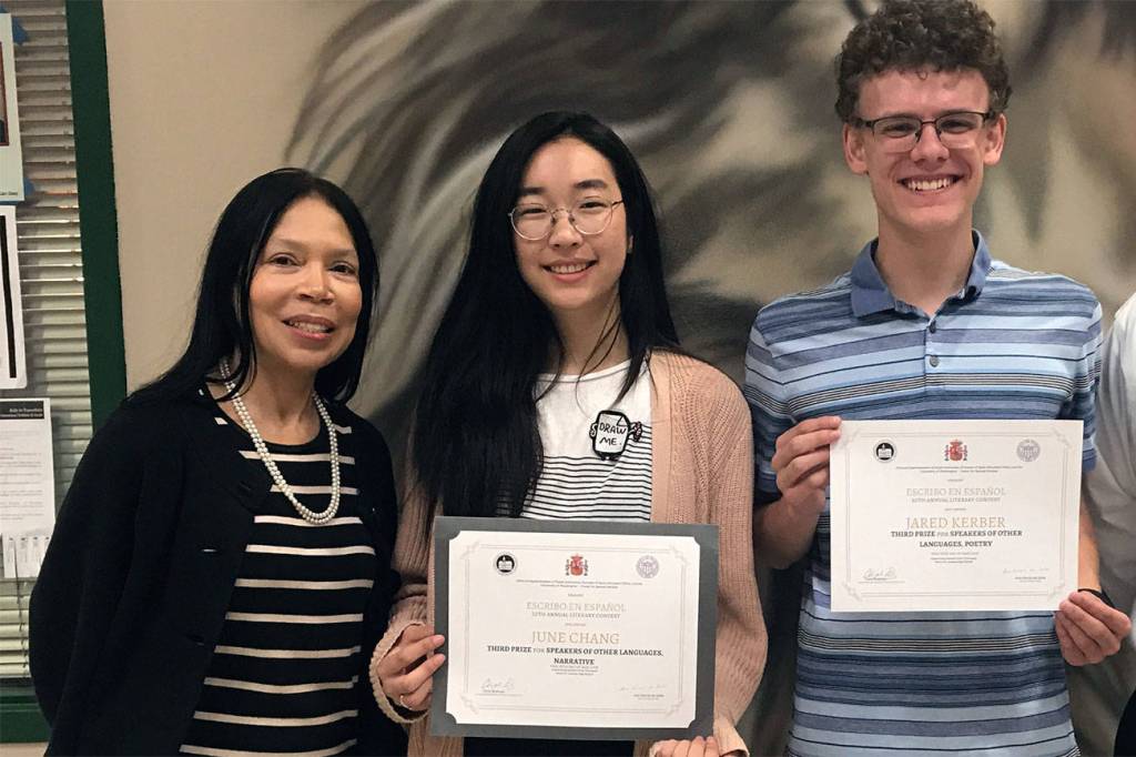 Everett High School student Carlos Rodriguez (from left), AP Spanish teacher Margarita Hurtado and student Jocelyn Ramirez celebrate top awards in the 20th annual “Yo escribo en Español” literacy contest. (Contributed photo)