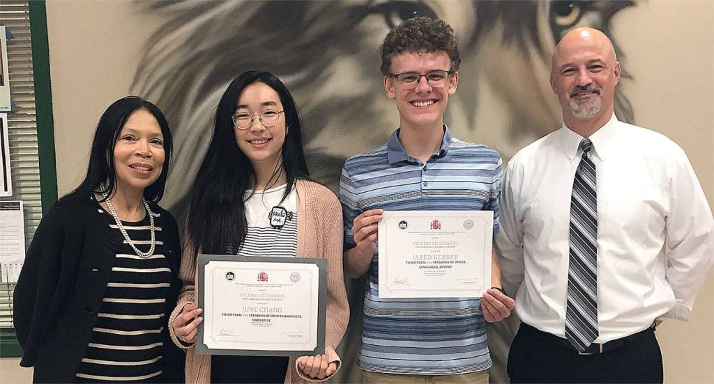Jackson High School teacher Ivett Thompson (from left), students June Chang and Jared Kerber, and Principal Dave Peters celebrate the students’ top awards in the 20th annual “Yo escribo en Español” literacy contest. (Contributed photo)