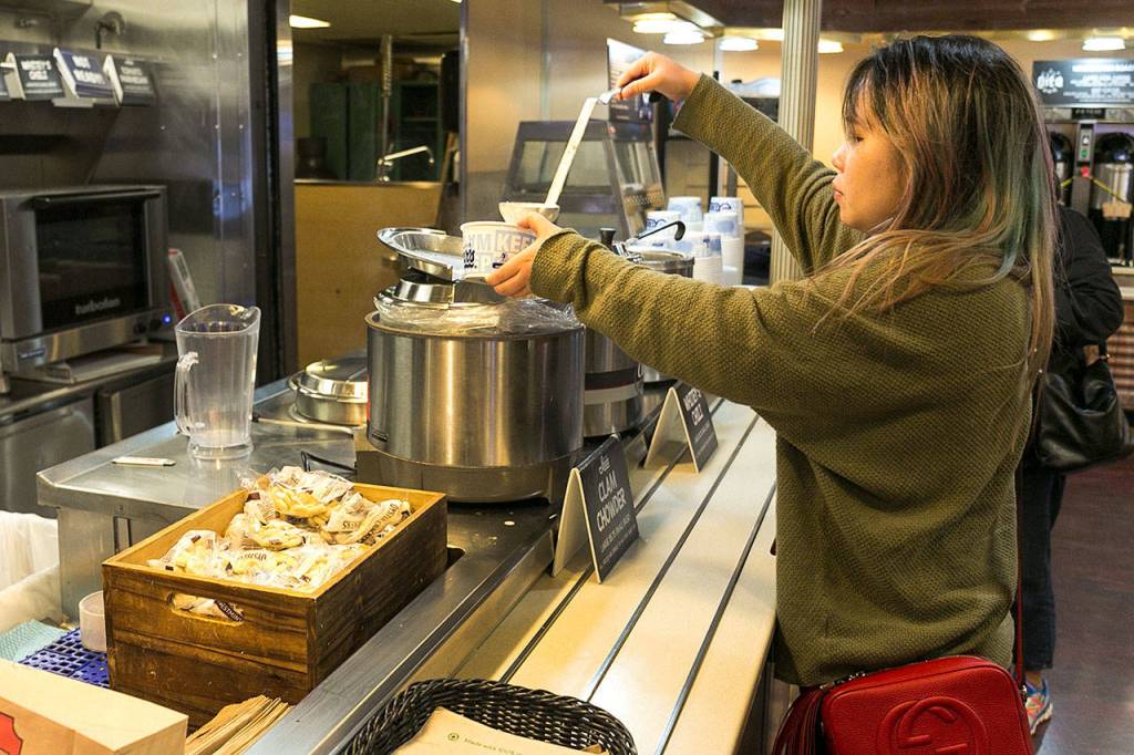 Offerings include fresh fruit, Ivar’s clam chowder, Caffe Vita coffee, Beecher’s mac & cheese, Uli’s Famous Sausage, CB’s nuts, Sound kombucha, Seahawks cookies by Schwartz Brothers Bakery, Walla Walla wines and Whidbey Island Ice Cream.