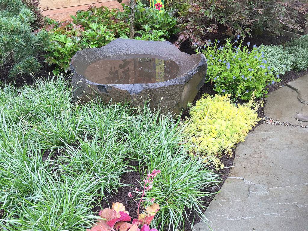 Each June in my display garden at Sorticulture, Everett’s Garden Arts Festival at Legion Memorial Park, it’s fun to notice how the water feature in the display draws attention.