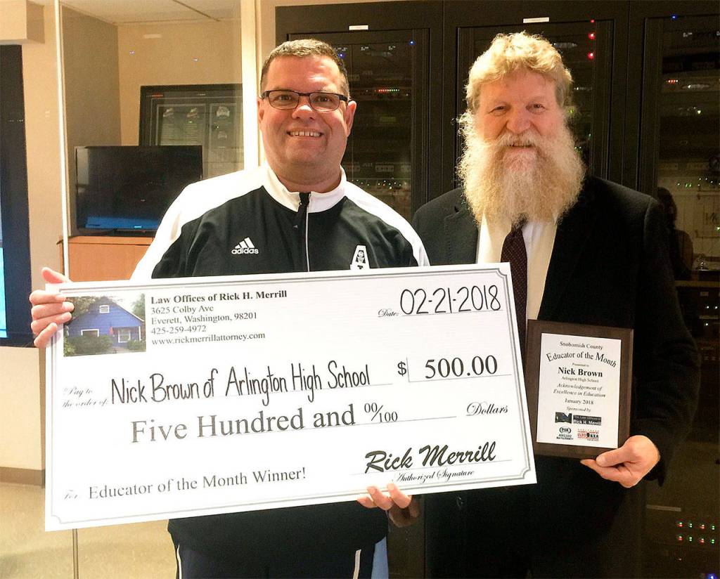 Everett attorney Rick Merrill sponsors an Educator of the Month award program that honors local teachers with $500 awards and a plaque. Recipients are nominated by the public. Winners this school year included Marissa Nilsen of Centennial Middle School in Snohomish; Autumn Ipock of Mount Pilchuck Elementary in Lake Stevens; Aminda Gonzales of Sky Valley Education Center in Monroe; Nick Brown of Arlington High School; and Diane Meyer of Lakewood Middle School.