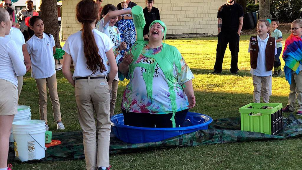 The girls had a giddy incentive: covering their troop leader with goop. One girl sold 2,300 boxes of cookies and poured a gallon and a half over Fish, who took it with smiles in a kiddie pool set up outside at Legion Memorial Park.