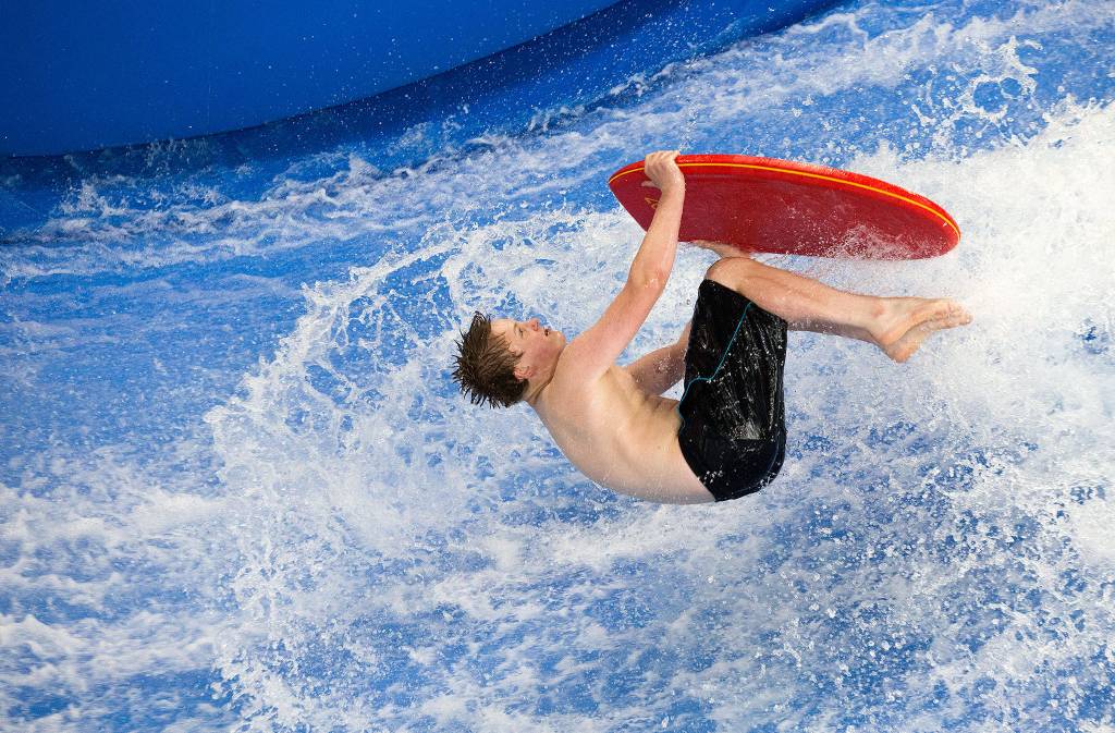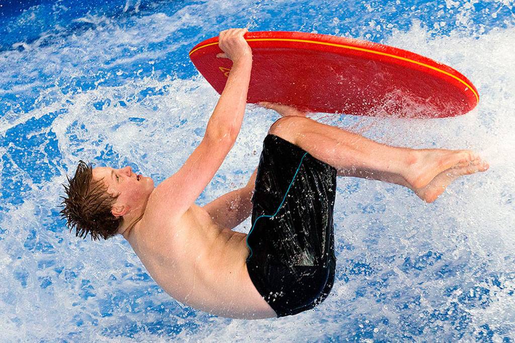In preparation for the FlowRider Pro/Am competition on Saturday, flowboarder Aiden Fox-Bailey, 15, barrel rolls a bodyboard at the Snohomish Aquatic Center on June 28 in Snohomish. (Andy Bronson / The Herald)