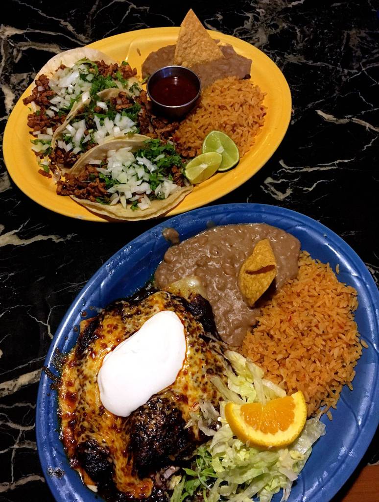 Beware: If you call a brittle, corn shell from a box, filled with a tablespoon of greasy ground beef, a “taco,” don’t waste good table space at Casa Guerrero. Tacos al pastor is one of my favorites. They’re “real” tacos, like you get on the street in Mexico or Texas: a pair of corn tortillas wrapping a healthy portion of grilled meat, chopped onion and cilantro. Three of them come with a couple of lime wedges you can — and should — squeeze on. The restaurant also offers a nice, spicy chile sauce that I’m now addicted to.