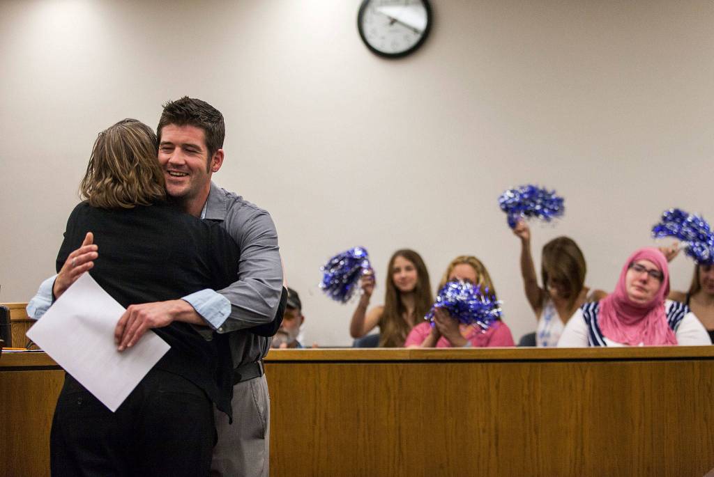 Brossard’s father hands a certificate of completion to his son, and the courtroom erupts with applause.