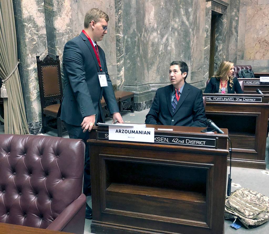 During this year’s state conference, two local students won awards. Alexander Arzoumanian from Mill Creek was named outstanding senator and Trinity Klomparens from Stanwood was named outstanding representative.