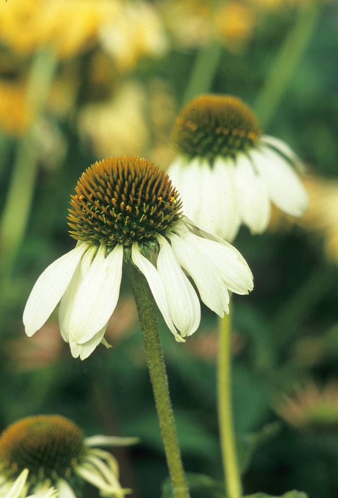 What: Unusual white flowers top this choice coneflower selection. Profuse blooms cover Echinacea purpurea “White Swan” from mid-summer to early fall. White Swan coneflower is a bold, sturdy perennial that stands out in the late summer garden with dramatic daisy-like flowers with a large orange cone-shaped center contrasting against its pure white petals. A long flowering perennial, use it in combination with other late season delights. Its pale colors play well off other paler hues, like the fine white streaked foliage of Miscanthus sinensis “Morning Light.” Add it to the riot of colors in the herbaceous border to help cool hotter tones. It is an excellent combination plant with hardy geraniums, tall campanulas and asters.