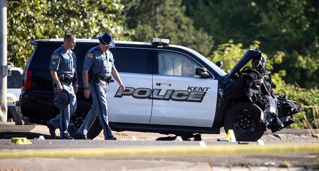According to preliminary information, officers pursued the vehicle on Reith and Kent Des Moines roads, where it turned around and came back toward officers, Mead said. As the fleeing vehicle came through the intersection of Kent Des Moines Road and West Meeker Street, the pursuing patrol vehicle struck the officer while spike strips were deployed, Mead said.