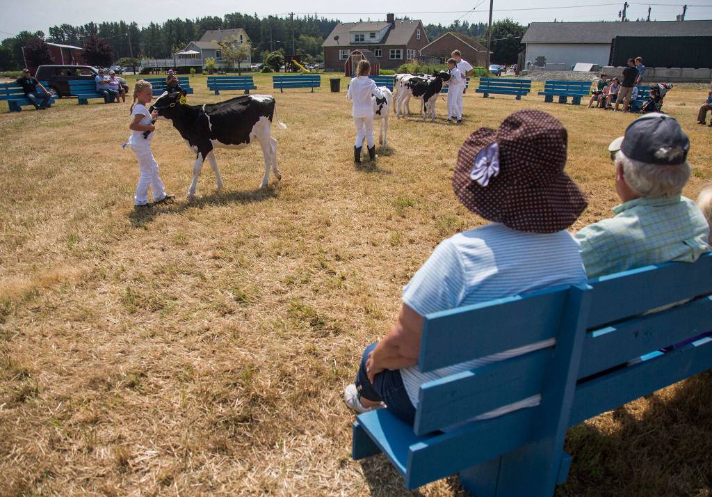 People cather to watch the livestock judging during the Silvana Fair off of Pioneer Highway on Saturday, July 28, 2018 in Silvana, Wa. (Olivia Vanni / The Herald)