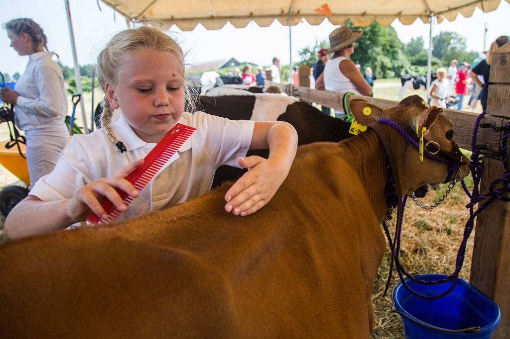 Annalyn Rogers, 7, works on combing her cow Caramel Princess’ hair during the Silvana Fair off of Pioneer Highway on Saturday, July 28, 2018 in Silvana, Wa. (Olivia Vanni / The Herald)