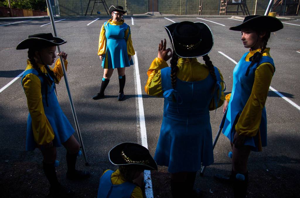 Hailey Whitish talks to other members of the Ballard Eagle Drill Team before the start of the Tour de Terrace parade on Friday, July 27, 2018 in Mountlake Terrace, Wa. (Olivia Vanni / The Herald)
