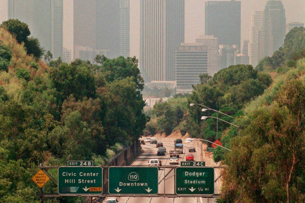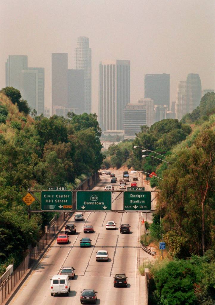 In this 1998 photo, traffic drives toward downtown Los Angeles on the 110 freeway as a curtain of smog shrouds the skyline. California greenhouse gas emissions fell below 1990 levels, meeting an early target years ahead of schedule and putting the state well on its way toward reaching long-term goals to fight climate change. (AP Photo/Nick Ut, File)