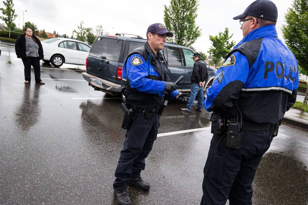 It’s raining so hard Monroe police have to squint though the streaked windshields of their unmarked cars. Three officers have been watching the Ford for the past half-hour. Their laptops tell them this guy was caught up in a shoplifting case months ago in Redmond. He emerges from a different door, retreating to the Ford at a brisk pace.