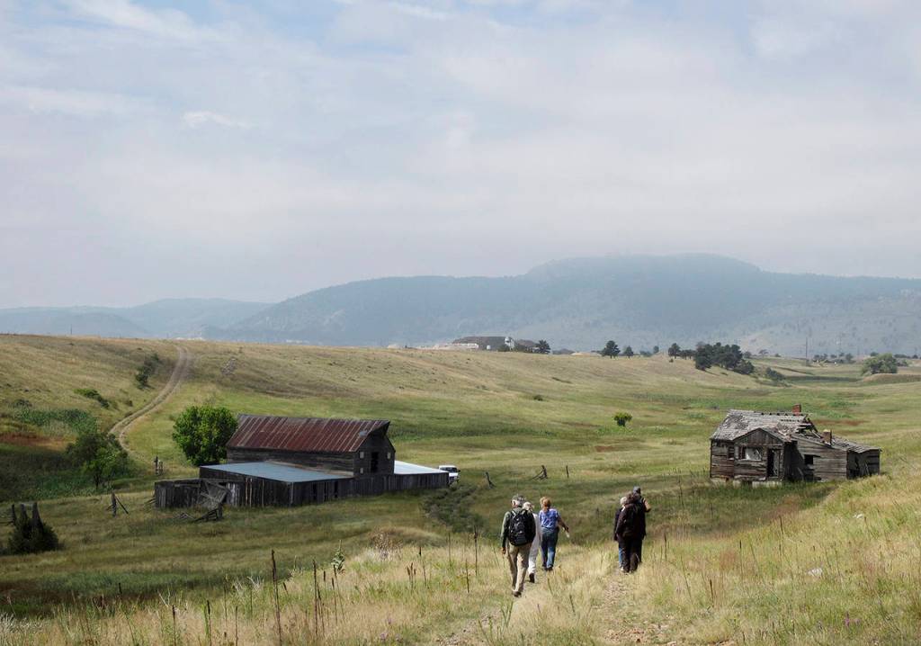 In this 2017 photo, visitors approach a former ranch house and barn during a guided hike on the Rocky Flats National Wildlife Refuge near Denver. (AP Photo/Dan Elliott, File)