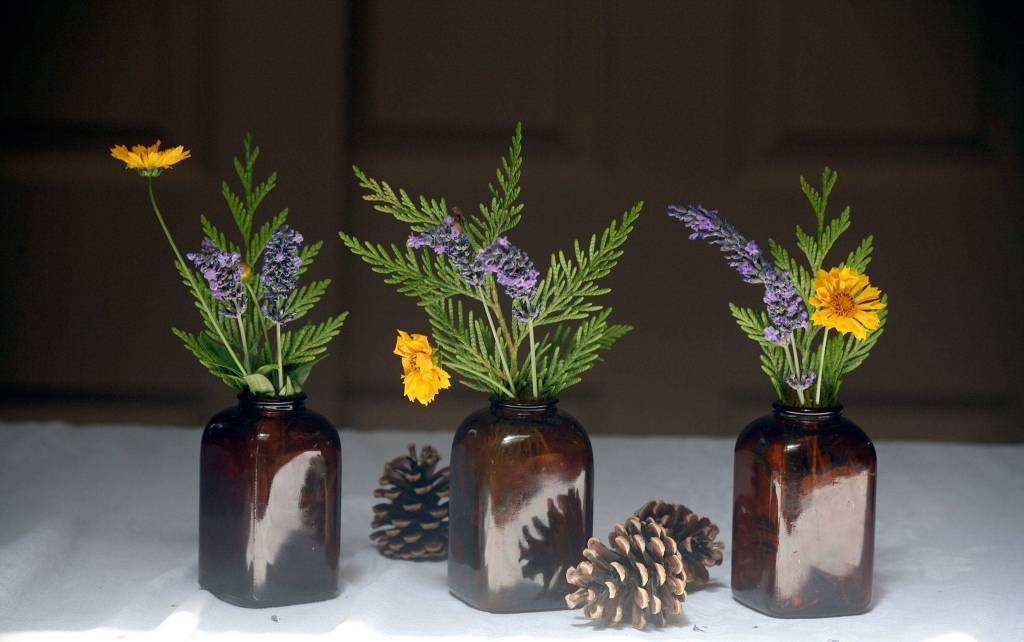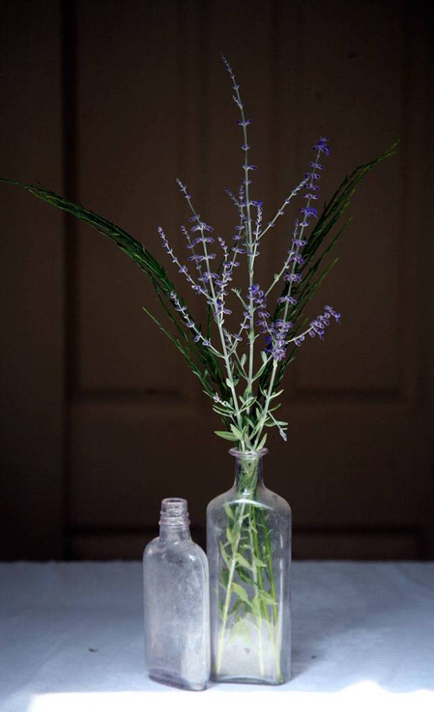 These modest but interesting bouquets are at home in a collection of old jars, bottles and vases, grabbed at garage sales or thrift stores over the years. The only thing you add to create a lovely little floral “moment” are a few stems of whatever the yard has to offer. Don’t forget the greenery — and sometimes it’s all you need.