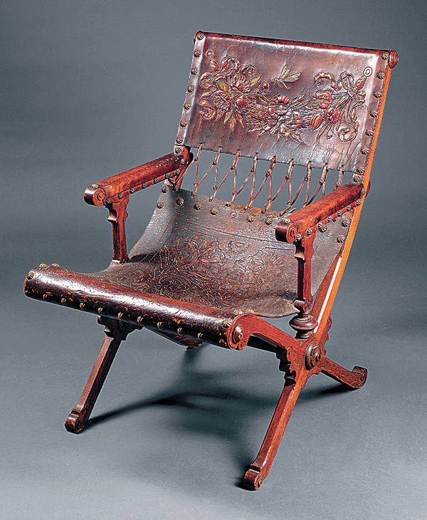This chair has two wooden X-shaped sides held together with horizontal rails. The sling back and seat is made of tooled leather with an Art Nouveau design that suggests a date in the late 1800s. It sold at a Neal Auction in March 2018 for $976.
