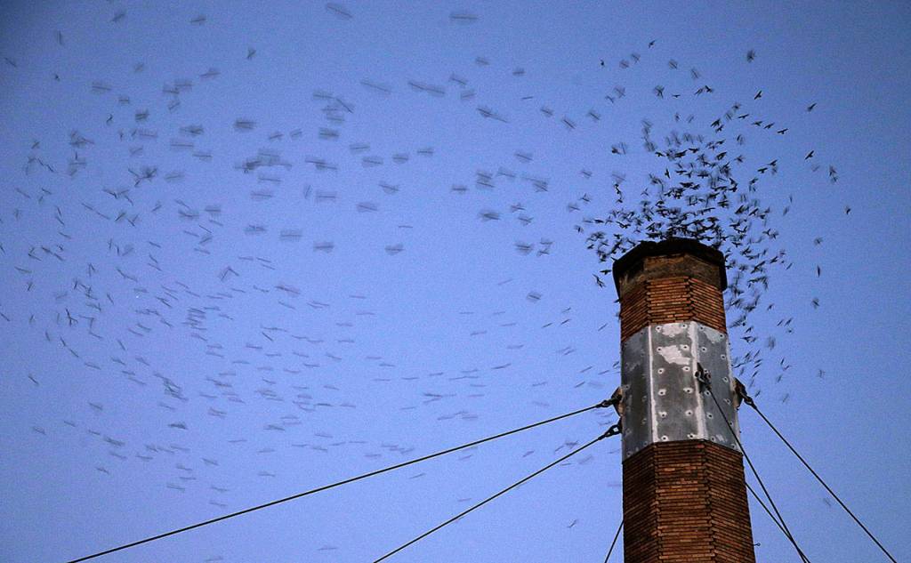 In this Sept. 23, 2016 photo, migratory Vaux’s swifts are a blur as they race to roost for the night inside a large, brick chimney at Chapman Elementary School in Portland, Oregon. Numbers of Vaux’s swifts are in decline, in part scientists say because of the destruction of the brick chimneys that they use to roost during their annual fall migration. (Don Ryan/AP file)