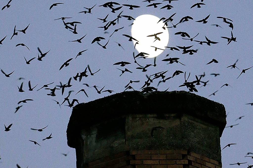 The moon is visible in the background as a multitude of migratory Vaux’s swifts flock to roost for the night inside a brick chimney at Chapman Elementary School in Portland, Oregon, on Sept. 13, 2016. (Don Ryan/AP file)