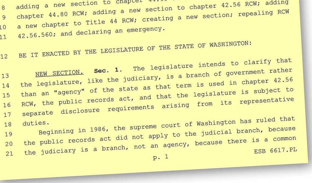 Rep. Mark Harmsworth, R-Mill Creek, was one of only seven House members who voted against SB 6617. First elected in 2014, Harmsworth served two terms on the Mill Creek City Council and, thus, has familiarity with the requirements of the Public Records Act.