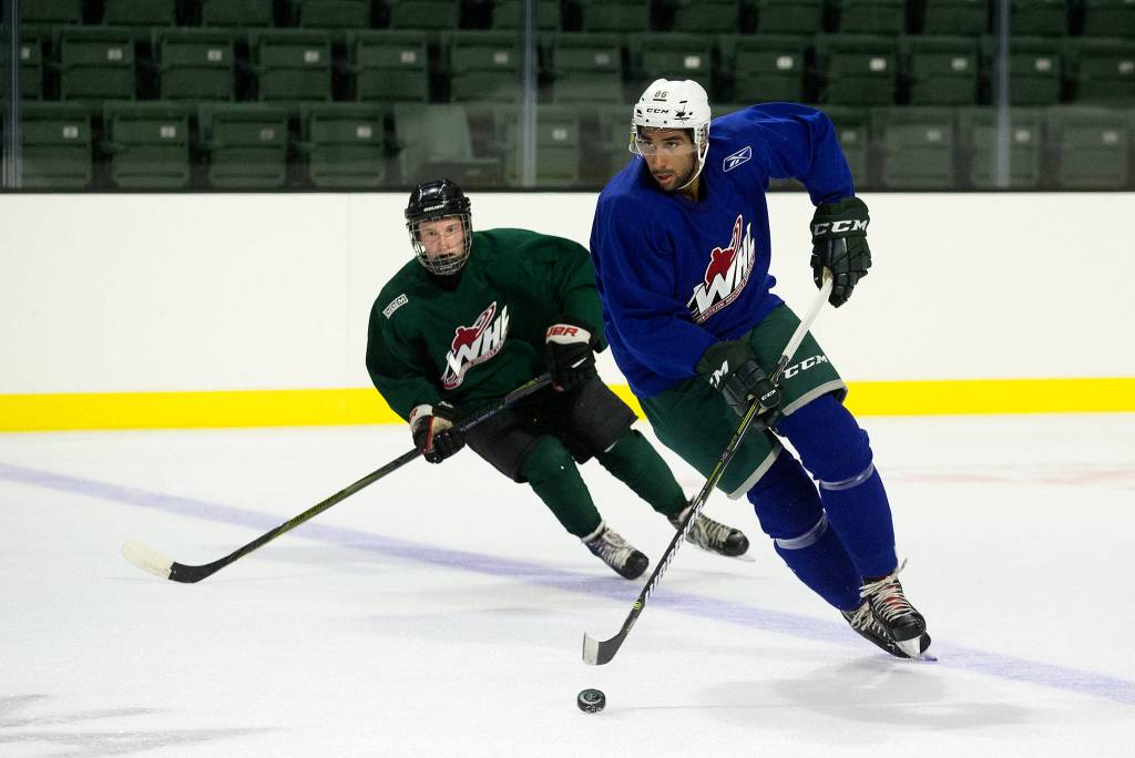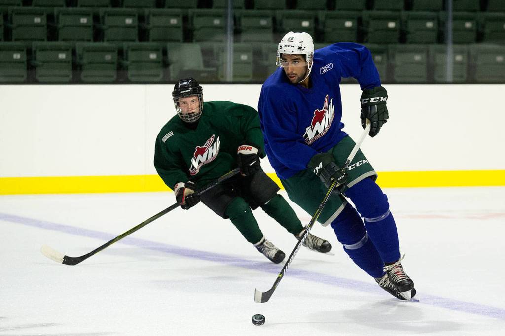 Silvertips defenseman Sahvan Khaira (right) skates during a training-camp practice on Aug. 23, 2018, at Angel of the Winds Arena in Everett. (Andy Bronson / The Herald)