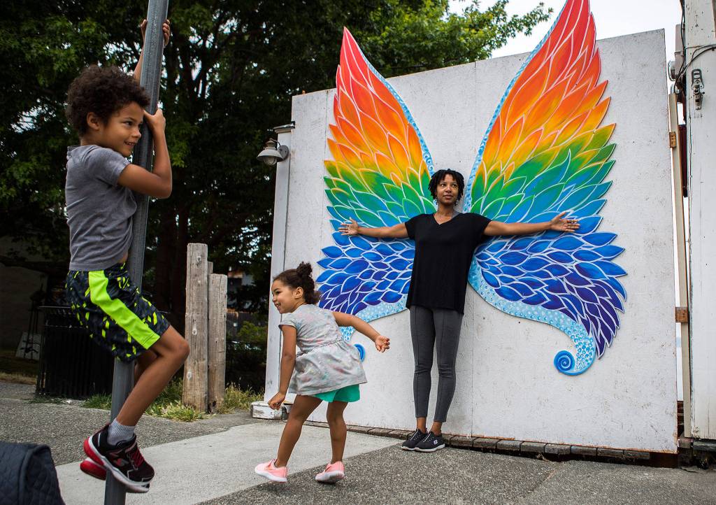 Lindsey T.H. Jackson (right) and her children, Cohen, 6 (left) and Taylor, 4 (center) pose for pictures in front of the butterfly wing art installation on Aug. 16 in Langley. (Olivia Vanni / The Herald)