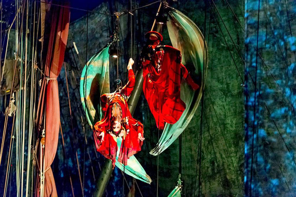 The story unfolds on the Amara Zee, a ship built specifically for theater in 1997 and modeled after a Thames River sailing barge. Aerialists swing and spin from an 8-foot-tall deck and 40-foot-tall trusses using various apparatuses, including hoops, a swing and a zip line.