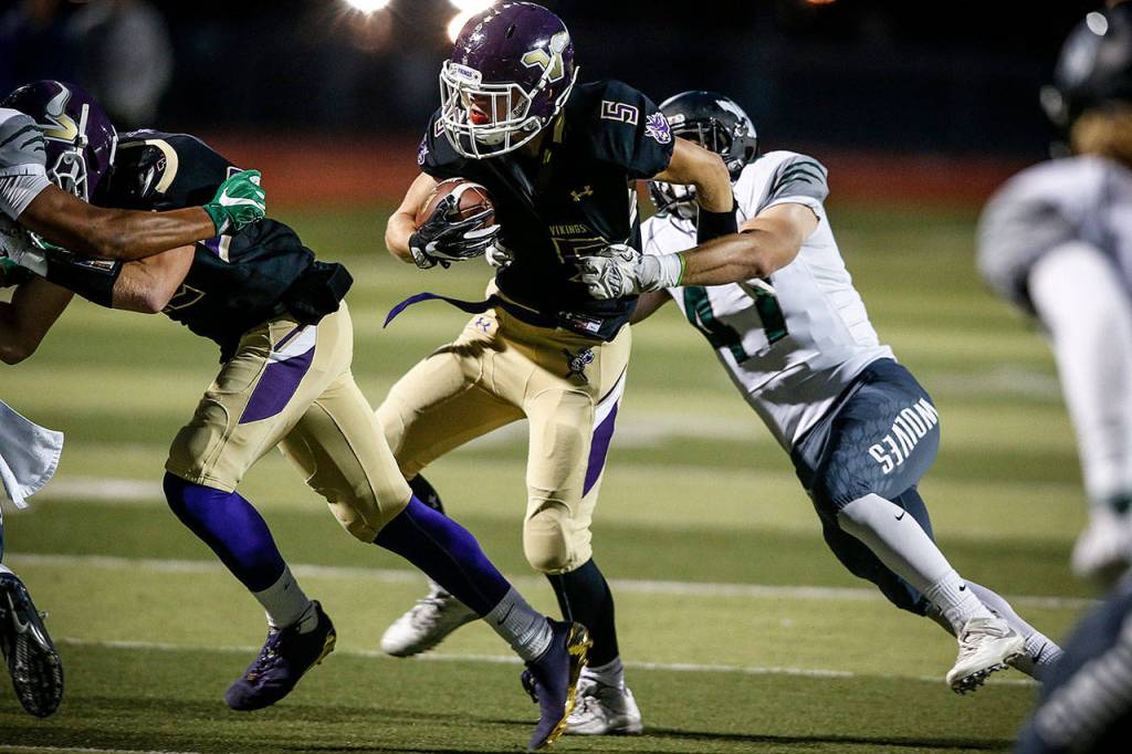 Lake Stevens’ Tom Lewis (5) plows through Jackson’s defense during a game at Lake Stevens High School on Sept. 29, 2017. (Ian Terry / The Herald)