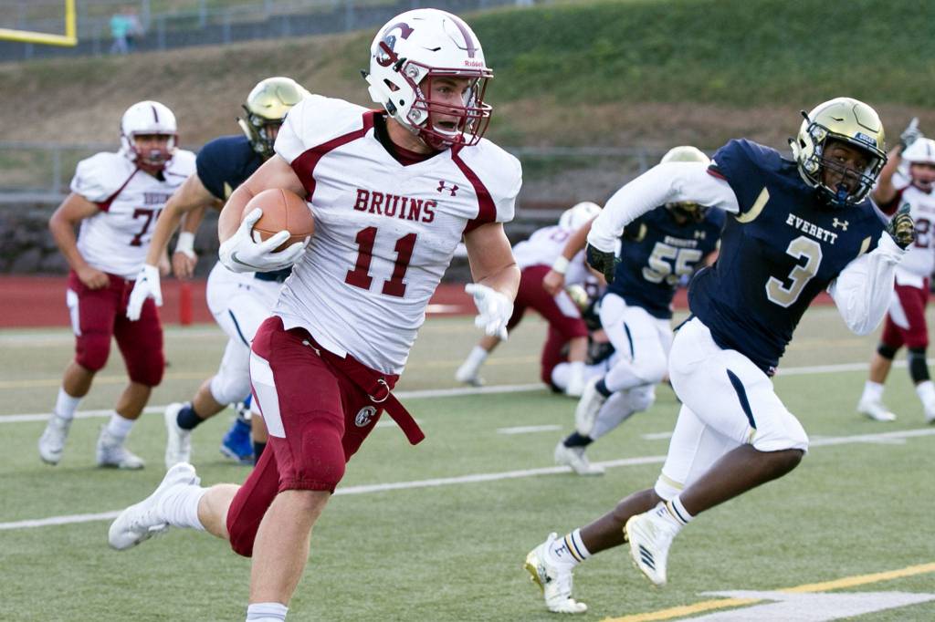 Cascade’s Noah Schmid (right) looks down field for pass Friday night at Everett Memorial Stadium in Everett on August 31, 2018. Cascade won 32-22. (Kevin Clark / The Herald)