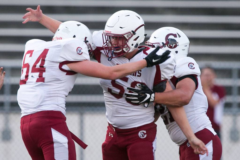 Cascade’s Jon Shaffer (center) celebrates a sack with teammates Cascade’s Billy Burgess (left) and Cascade’s Jacob Bauer (right) Friday night at Everett Memorial Stadium in Everett on August 31, 2018. Cascade won 32-22. (Kevin Clark / The Herald)