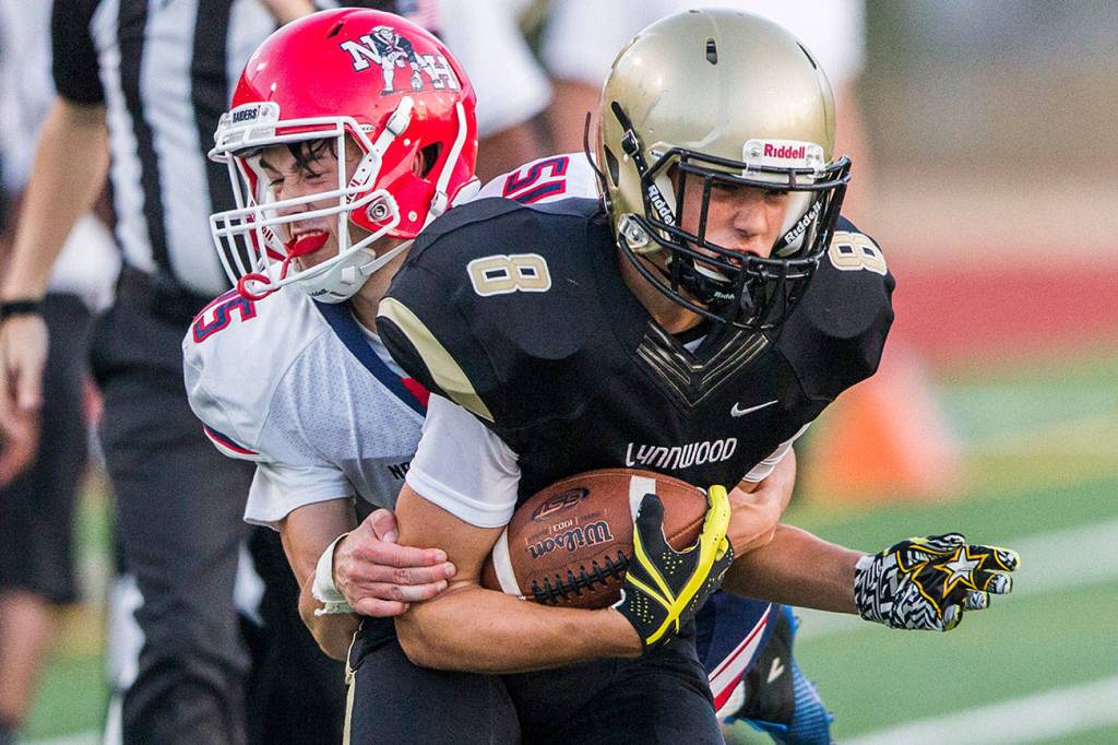 Lynnwood’s Tanner Fahey is tackled by Nathan Hale’s Chris Coon during Fridays game against Nathan Hale on Aug. 31, 2018 in Edmonds, Wa. (Olivia Vanni / The Herald)