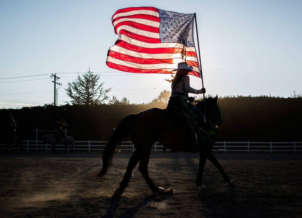 A member of the Stirrin’ Dust Drill Team practices in the outdoor arena before the start of the Pro-West Rodeo at the Evergreen State Fair on Sept. 1, 2018 in Monroe, Wa. (Olivia Vanni / The Herald)