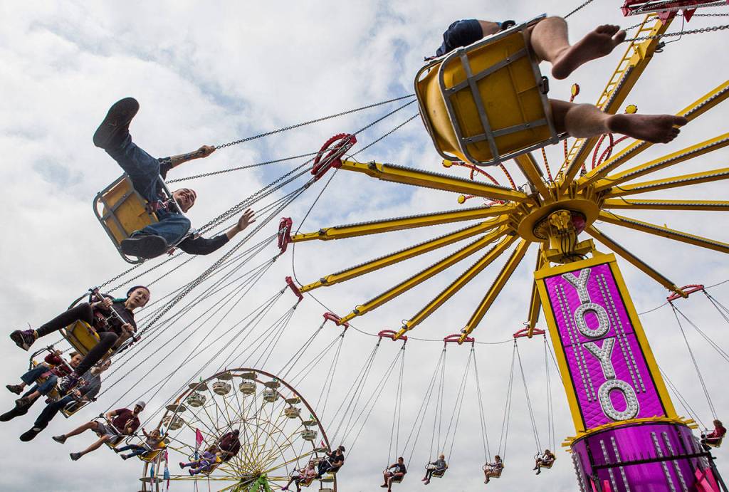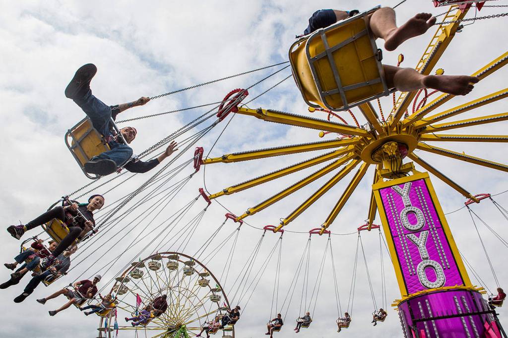People enjoy the Yoyo ride on opening day of the Evergreen State Fair on Aug. 23, 2018 in Monroe, Wa. (Olivia Vanni / The Herald)