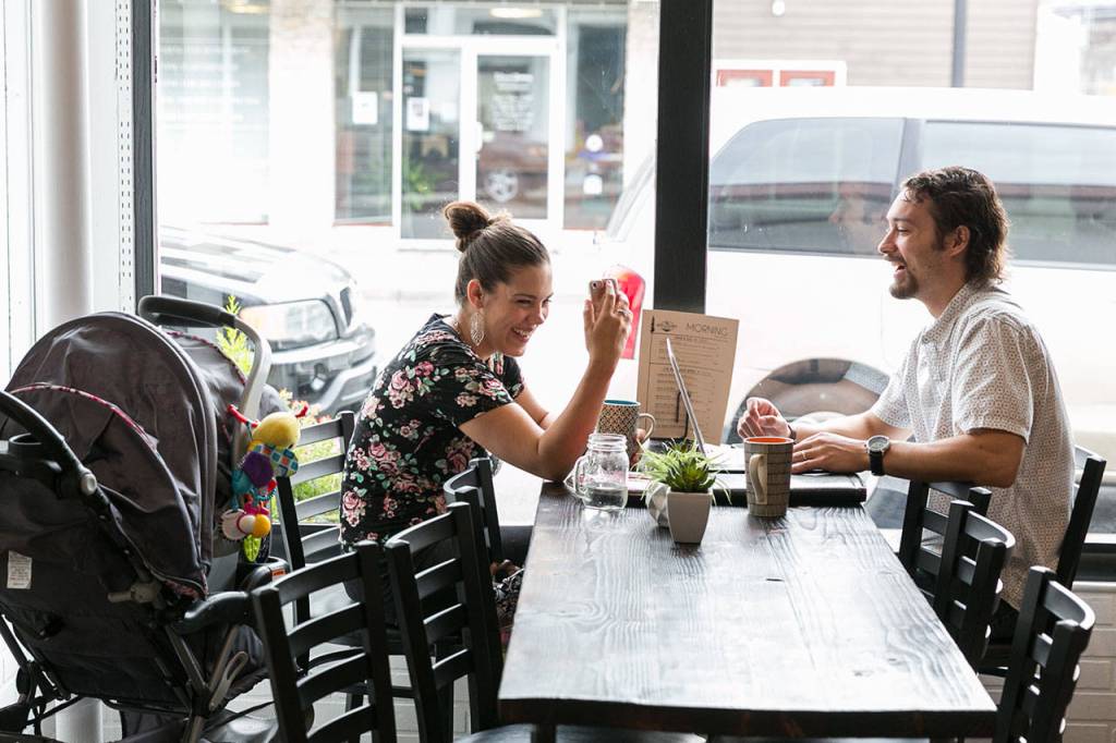 Kiersten Baiamonte, left, and Antonio Baiamonte enjoy coffee Friday morning at Moe’s Espresso in downtown Arlington on August 24, 2018. (Kevin Clark / The Herald)