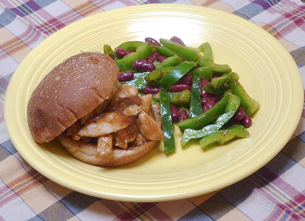 A juicy barbecued chicken sandwich with a bell pepper and bean salad makes an easy summer supper. Use bought cooked chicken breast or leftover chicken for this recipe. Bottled barbecue sauce helps makes this dinner a breeze.