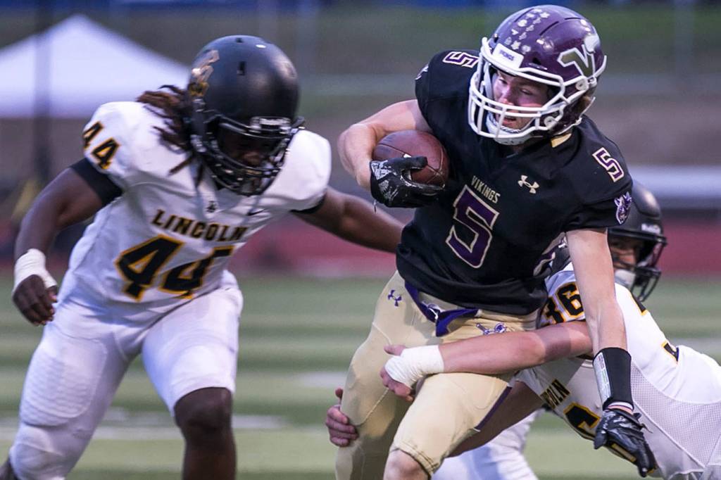 Lake Stevens’ Tom Lewis is tackled by Lincoln’s Troy Atkin with Lincoln’s Janoah Thomas (left) closing Friday at Lake Stevens High School. (Kevin Clark / The Herald)