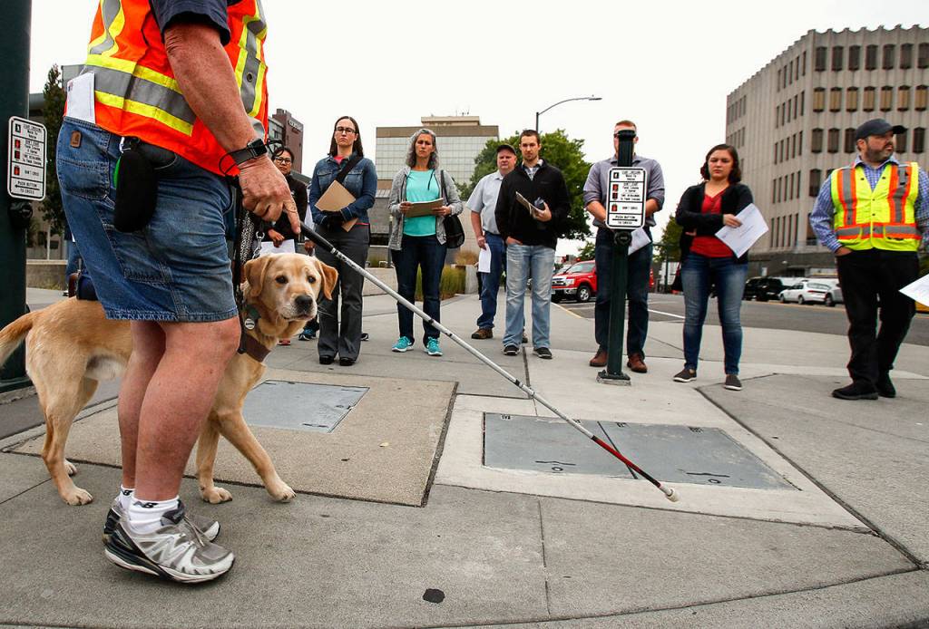 The Edmonds man, who is blind, led a walking tour of downtown Everett for area public works employees and contractors Friday. The tour was part of a one-day training workshop by Snohomish County to help participants better understand the standards for public right-of-way facilities — sidewalks, crosswalks, bus stops — under the Americans with Disabilities Act.