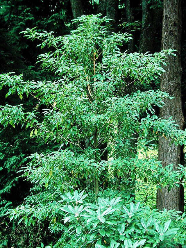 What: Trochodendron aralioides, commonly called the wheel tree, was once found only in collectors’ gardens, but it is now much more widely available. It is a lovely tree that produces a single main trunk from which are carried a whorl of horizontal branches, somewhat like the spokes of a wheel. Its evergreen leaves are long and tapered, and their bright green color contrast well with rhododendrons and the trunks of our native conifers. Planted as single specimen, it is eye-catching due to its distinctive growth habit. Wheel tree is in a genus by itself and is native to Japan and Korea.