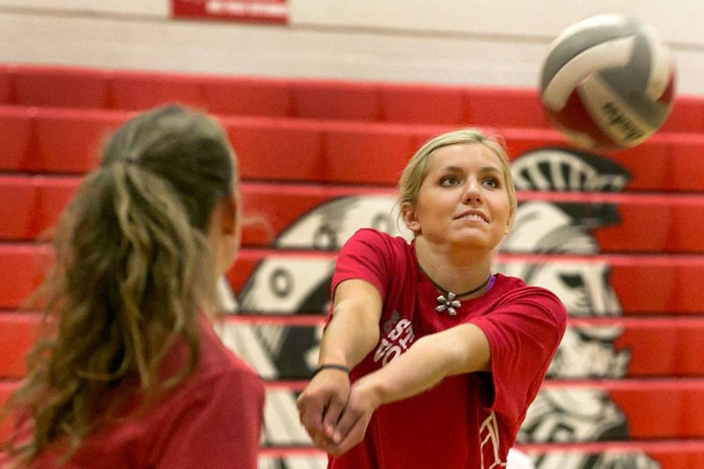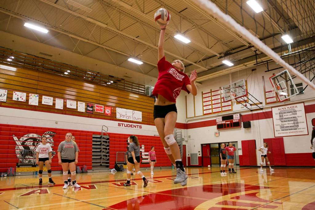 Stanwood senior Devon Martinka attempts a spike during practice on Sept. 12, 2018, at Stanwood High School. (Kevin Clark / The Herald)