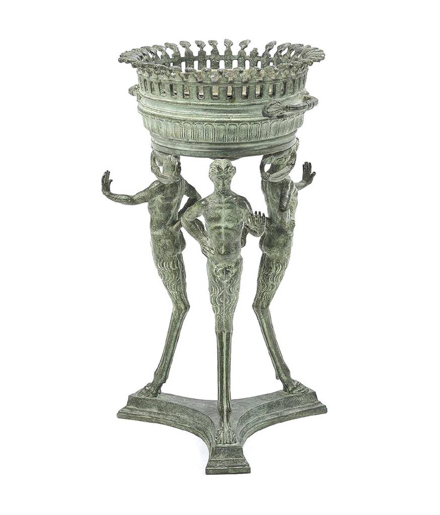 The popular bronze brazier had a pieced rim and a three-part foot with men with paw feet holding the fire pit on their heads. These copies were made with a green patina. One sold at a Cakebread auction in New Orleans for $500. It is 10 inches high and almost 6 inches in diameter.