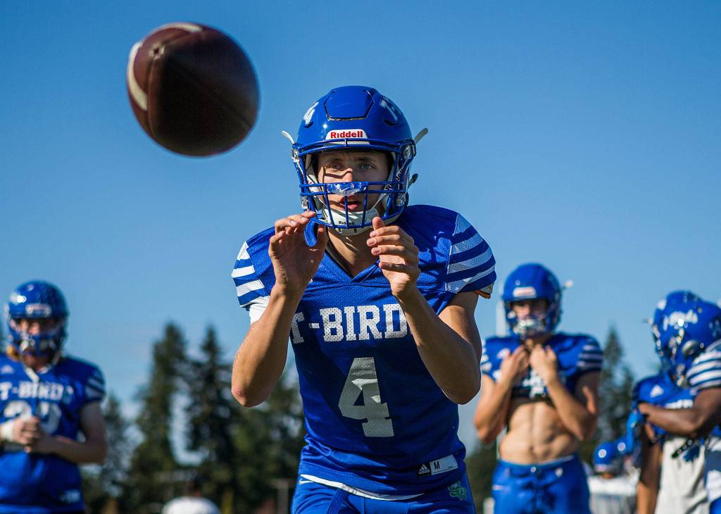 Shorewood quarterback David Snell catches a snap during practice Wednesday afternoon at Shorewood High School in Shoreline. (Olivia Vanni / The Herald)