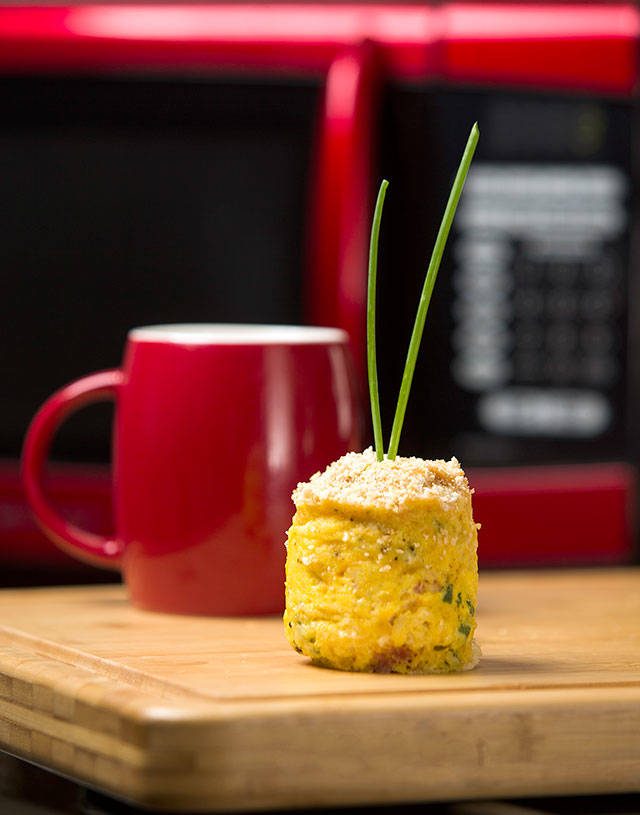 This recipe is not only faster but also even easier than the quiche. All you do is dump the ingredients into a bowl and microwave on high for 90 seconds, stopping every 30 seconds to stir. The cheesecake starts to take form in the final 30 seconds of nuking.