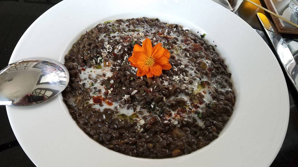 Looking over the menu, we were both separately — and immediately — taken with the description of the soup: beluga lentils with charred sage and coconut cream ($6.50 for a bowl).