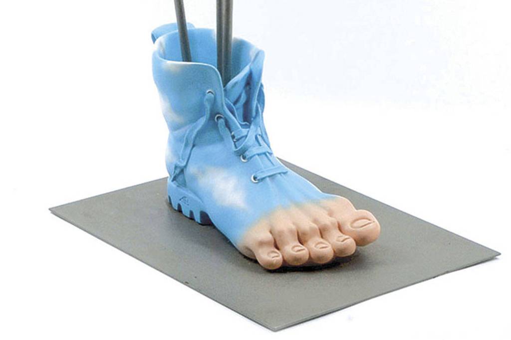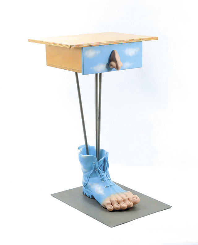 Perhaps the strangest table seen recently is the “Foot Art” side table. It has a flat top, one drawer with a human nose for a handle, and a resin foot for the base. The large foot in a blue boot supports the top on three metal rods stretching up from the inside of the boot. It was sold by Burchard Galleries in Florida.