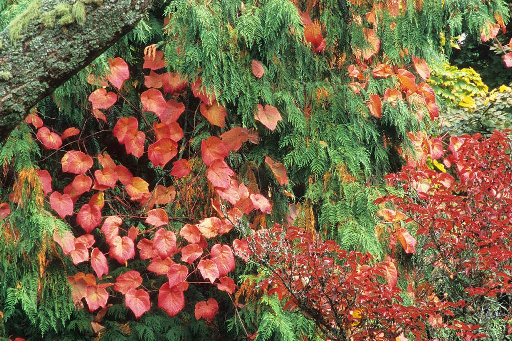 What: The common name for Vitis coignetiae — crimson glory vine — tells it all. It is indeed glorious when clothed in its large crimson autumnal garb. Its leaves are very large, often to a foot across, and heart-shaped in outline. Its veins are impressed into the upper surface, and its leaves are brown-felty beneath. Plant it on a trellis, against a fence or into a strong tree — wherever drama is required.