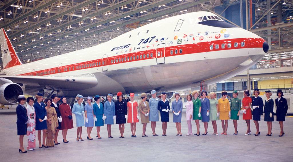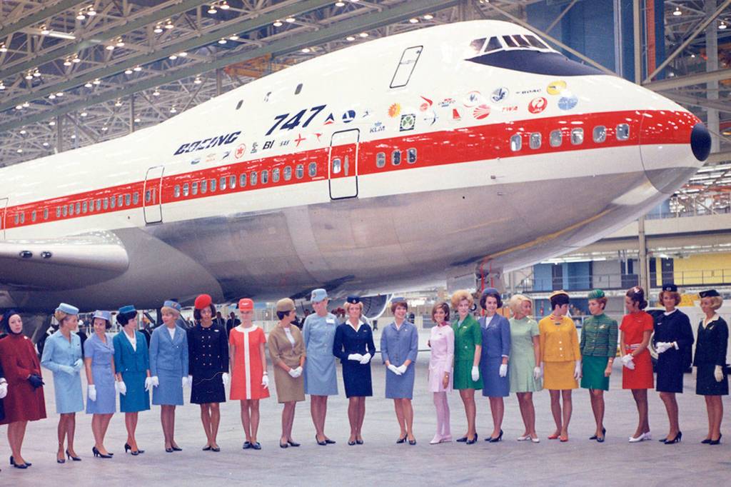 The 747’s big nose was adorned that day with the emblems of the 26 airlines that had committed to purchasing the first of the fleet. Among the logos: Pan Am, the airline that spurred Boeing to developing the first widebody jet, and United, Northwest, Delta and American.
