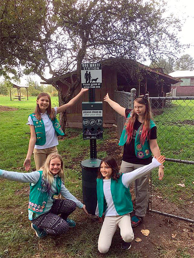 Scouts Annabelle Smith, Grace Lish, Genevieve Stoeckel and Ashley Vogel worked on improvements to the dog agility course in the Stormwater Wetlands Park. The girls added signs at the entrance of Eagle Trail to bring awareness of the agility course’s location. They also added a pet waste station at the course’s entrance gate.
