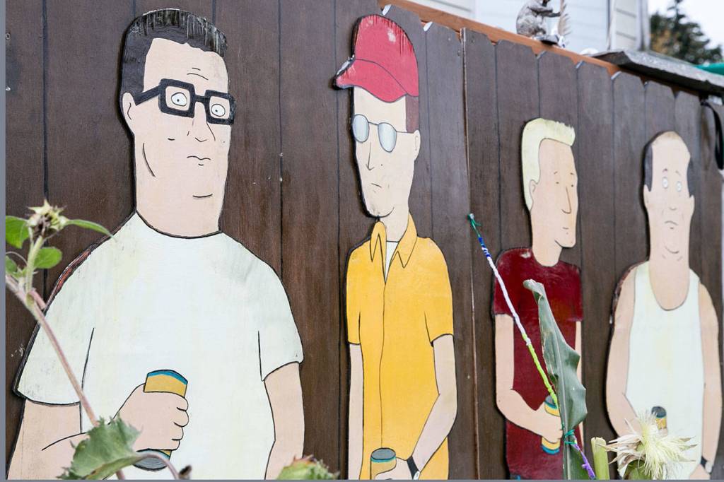 Kelly Hatley, 63, proudly displays characters from “King of the Hill” in his front yard in Freeland on Whidbey Island. An artist friend, Linda Frasier, painted the cutouts that are copied from the cartoon series. (Kevin Clark / The Herald)